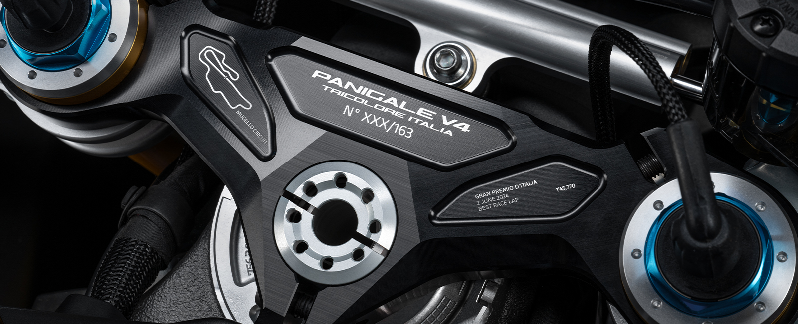 Ausgestattet mit einer oberen Gabelbrücke aus Billet-Aluminium mit einer exklusiven Note. Der Name und die Identifikationsnummer jedes Motorrads ist in die Gabelbrücke eingelasert. Zudem wird beim Startvorgang eine spezielle Displayanimation gezeigt. Das Layout der Rennstrecke in Mugello besiegelt die Feier des italienischen Sporttraums. Der Zündschlüssel verfügt über einen Aluminiumeinsatz mit der Seriennummer.