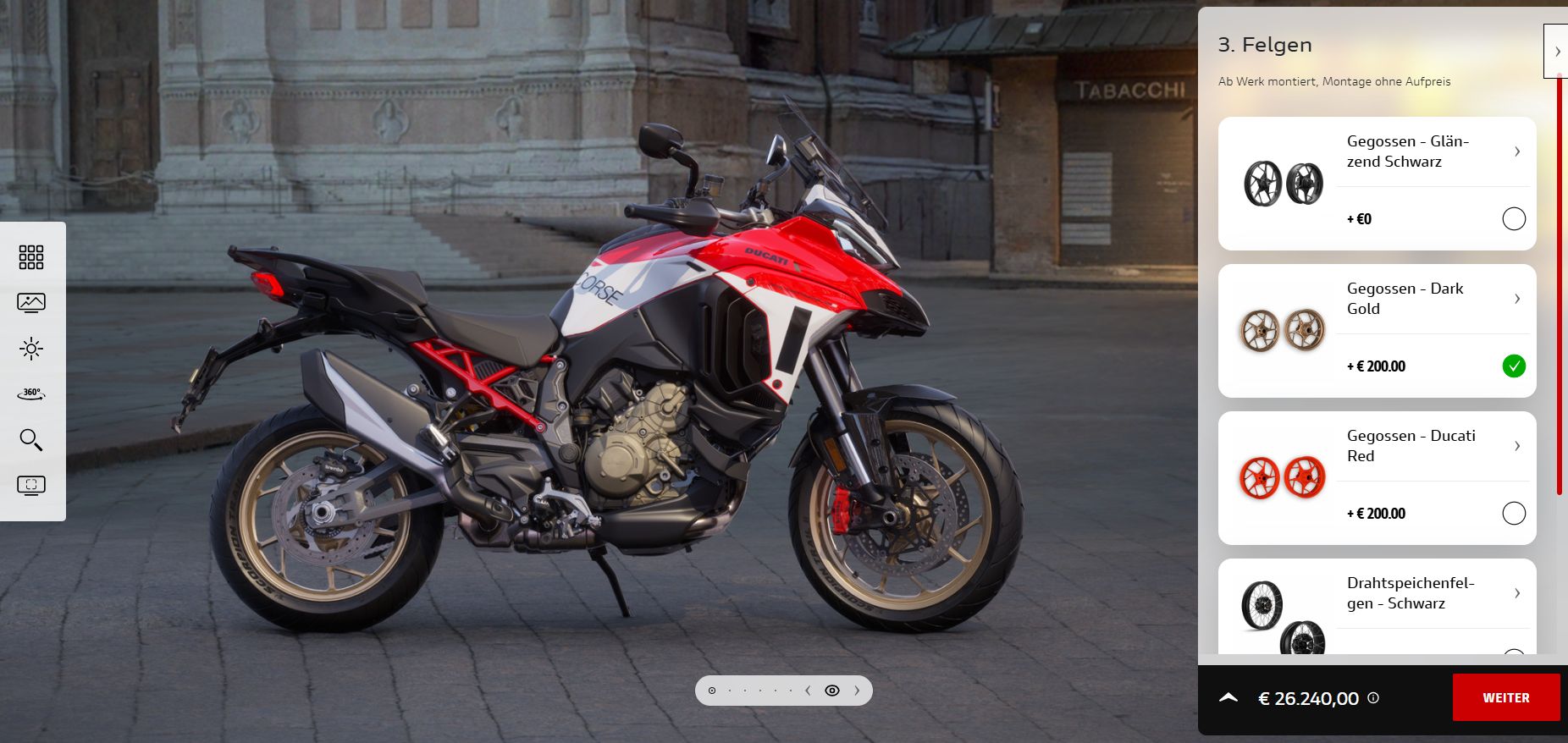 Auf technischer Ebene bietet das Ducati Factory Made-Programm eine breite Auswahl an Komponenten, darunter Gussräder in verschiedenen Farben, geschmiedete Leichtmetallräder oder Speichenräder sowie Farboptionen für den Heckrahmen und die Bremssättel. Darüber hinaus umfasst das Programm Konfigurationsoptionen für die Sitzhöhe von Fahrer und Sozius sowie für das Fahrwerk und ermöglicht so ein nahezu maßgeschneidertes Maß an Individualisierung für das Motorrad Deiner Träume – direkt ab Werk.